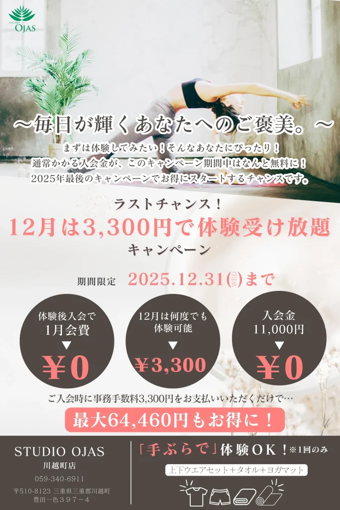 「桑名と四日市で最高のホットヨガ体験を。」女性専用のホットヨガスタジオSTUDIO OJAS